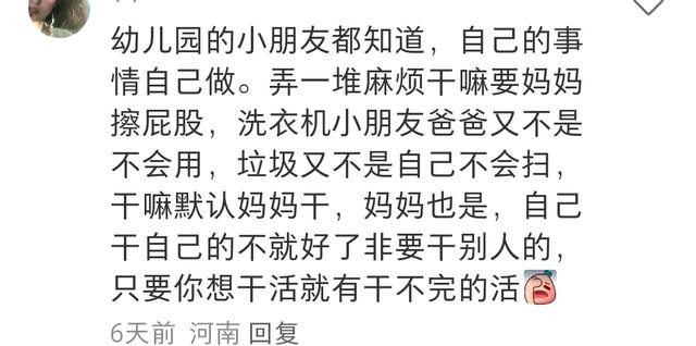 自从我跟我老公为了他到点没给孩子洗澡这件事情吵了一架之后…我就松弛很多了。教会孩子自己洗,衣服进洗衣机,卫生想搞就搞不想搞就放那,不争吵也不催孩子。每个人干好自己的事情。当然我的孩子长大了,如果你家的孩子还很小的话,妈妈确实要多付出一些。熬过去就好了。
